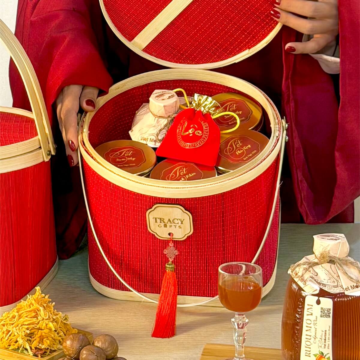 Lấy cảm hứng từ triết lý phương Đông, nơi vuông là đất, tròn là trời, giỏ quà “Lộc Đất Trời” ra đời như một biểu tượng của sự giao hòa và viên mãn. Đế vuông – tượng trưng cho nền tảng vững vàng, cho nỗ lực và gốc rễ bền chặt. Nắp tròn – biểu trưng cho may mắn, đủ đầy và thành quả trọn vẹn. Khi đất nâng trời, khi vuông đỡ tròn, ấy chính là phúc giao hòa, lộc sinh sôi.