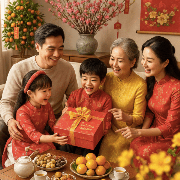 • Quà Tết truyền thống: Hộp bánh mứt, trà, rượu – gợi nhớ hương vị quê hương và sự đoàn viên.